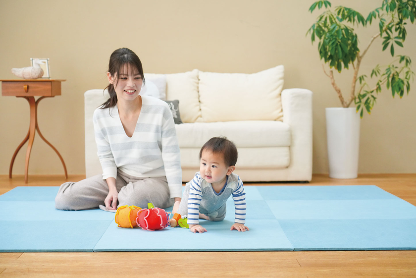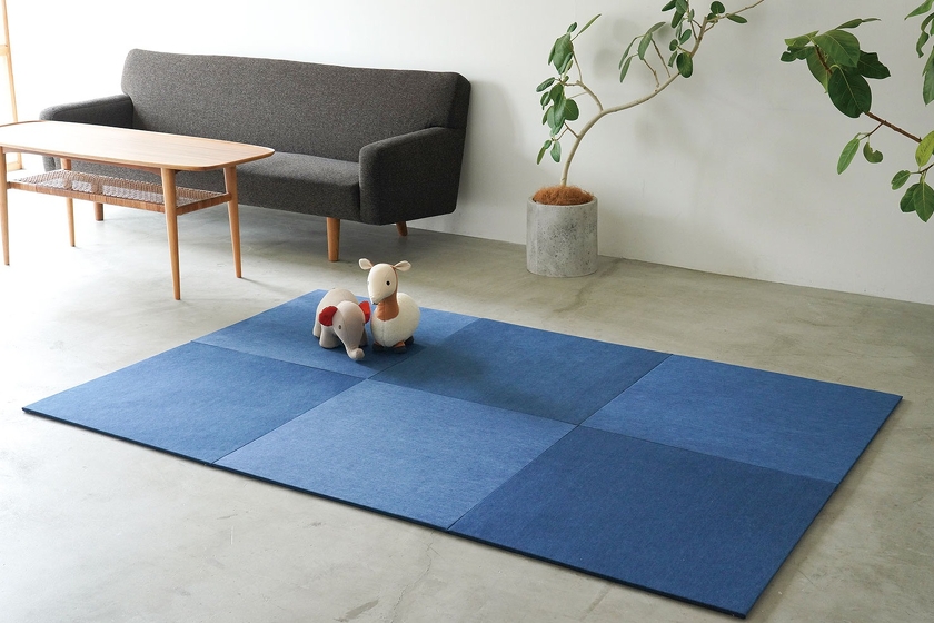 表面は肌に優しくて丈夫なデニム素材で、弾性、断熱調湿性、吸音性にも優れ、保育園でも導入されています。軽くて重ね収納もできるので、子育て中のママたちにも大好評。のびのびとした子育てに、一役も二役も買っています!
