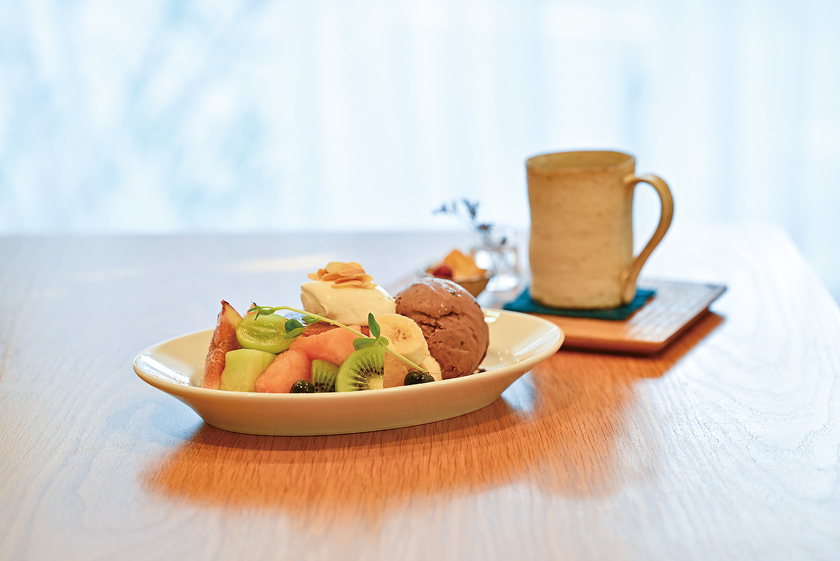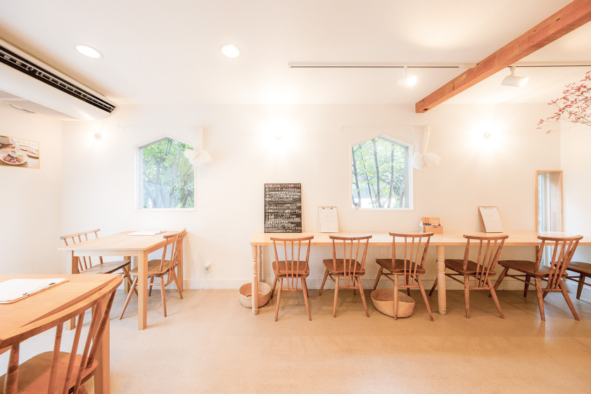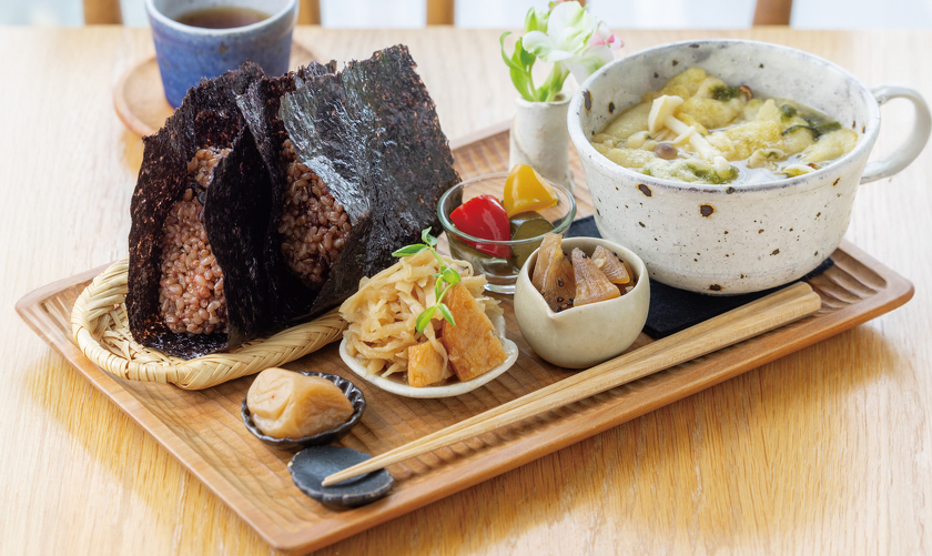 自然光を採り入れた明るくも落ち着きのある店内。酵素玄米を使ったおにぎりや、野菜たっぷりのサンドイッチなど、ヘルシーなカフェメニューが女性客にも大人気。一点一点吟味した器がランチタイムやカフェブレイクに彩りを添え、心も豊かになれる空間です。