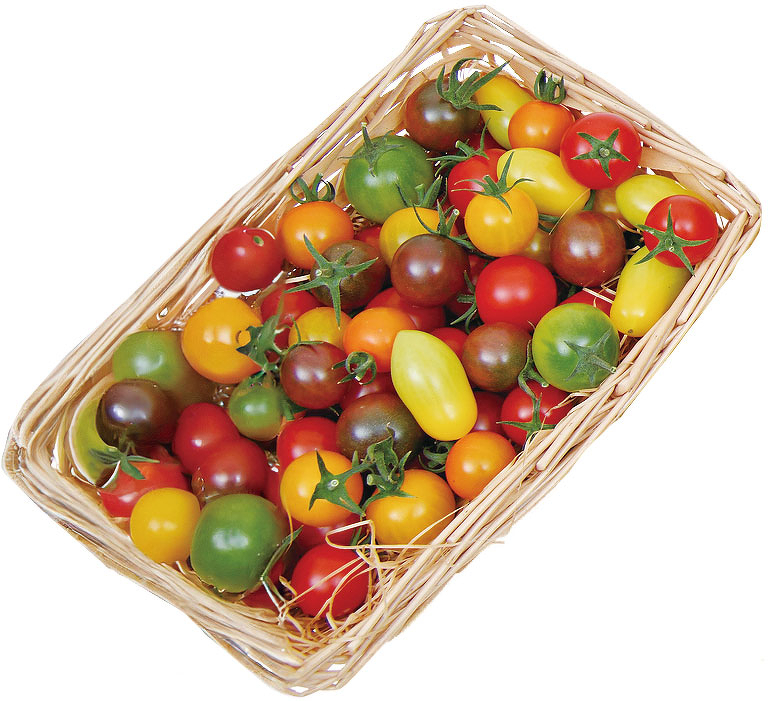 ハウスの中には赤や黄色のほか、緑や紫、黒のトマトが実り、ジュエリーを散りばめた宝石箱のよう。