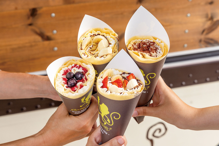 1枚ずつ丁寧に焼き上げたクレープは、スイーツ系からフード系など36種類。今日はどれにしようかな。