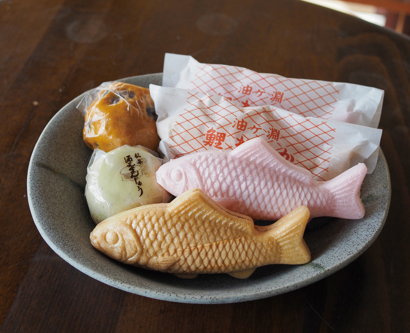 油ヶ淵は古くから鯉釣りの名所で、釣り客のお土産用にと考案したのが「鯉もなか」です。